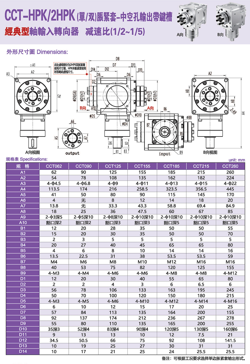 多樣化:輸出軸種類多樣化,有單出力軸型、雙出力軸型、中空軸型、中空法蘭型、中空軸錐形緊迫性、螺桿直線型、螺牙直線型。