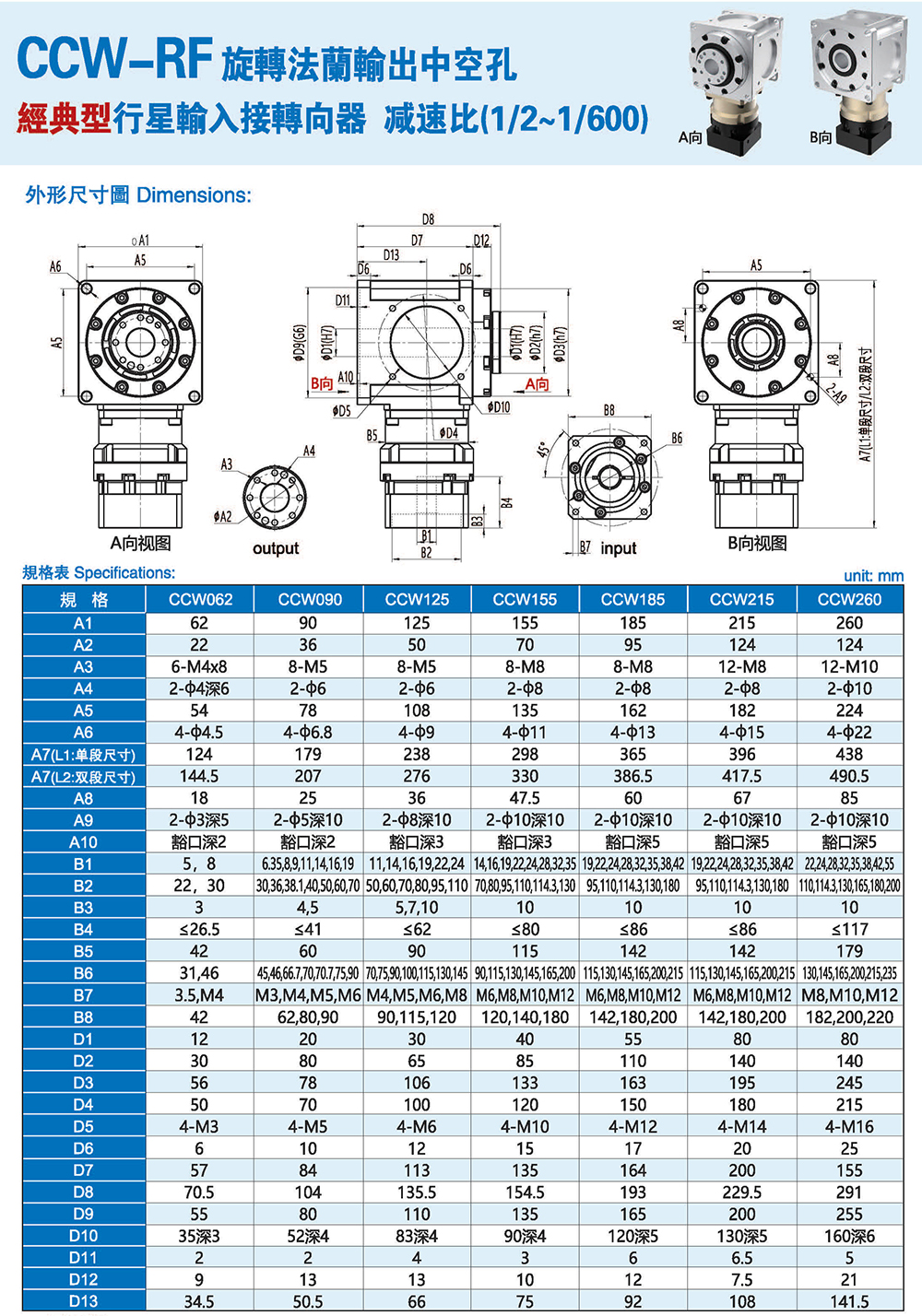 多樣化:輸出軸種類多樣化,有單出力軸型、雙出力軸型、中空軸型、中空法蘭型、中空軸錐形緊迫性、螺桿直線型、螺牙直線型。