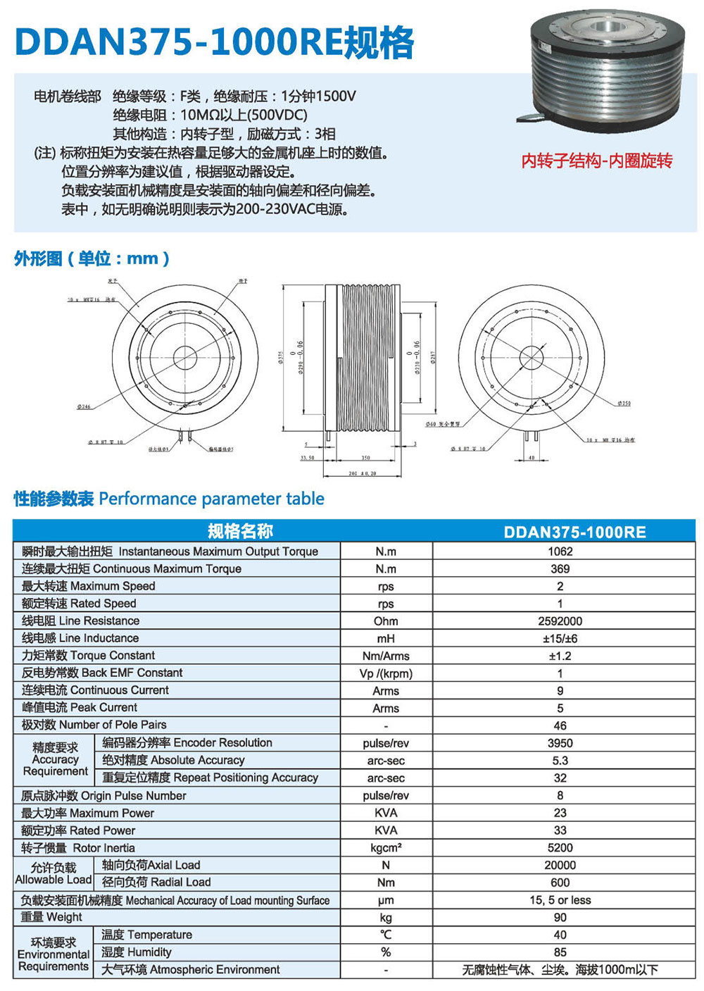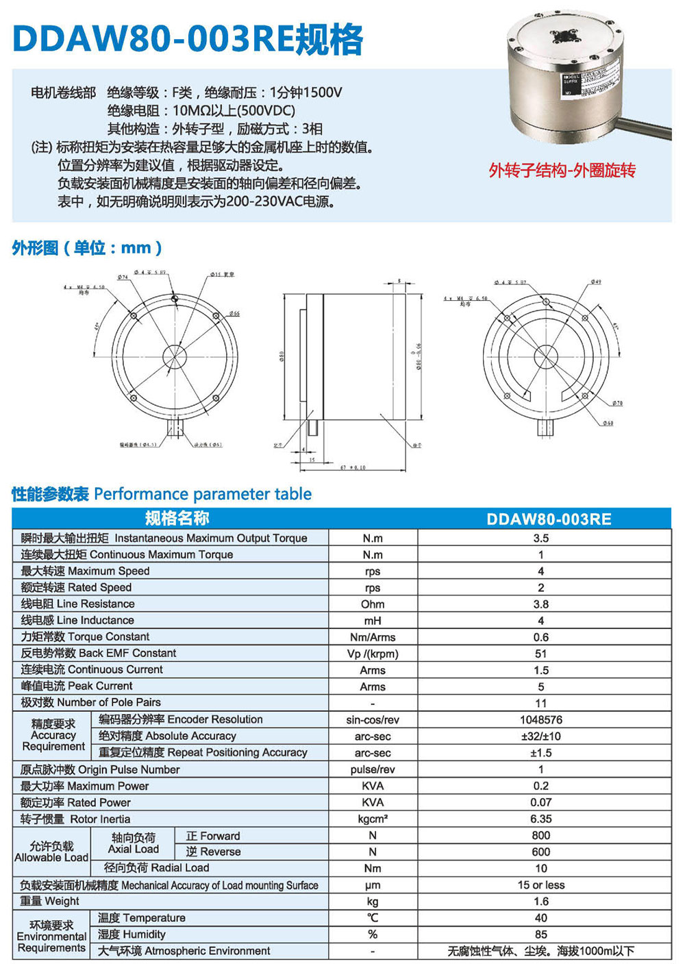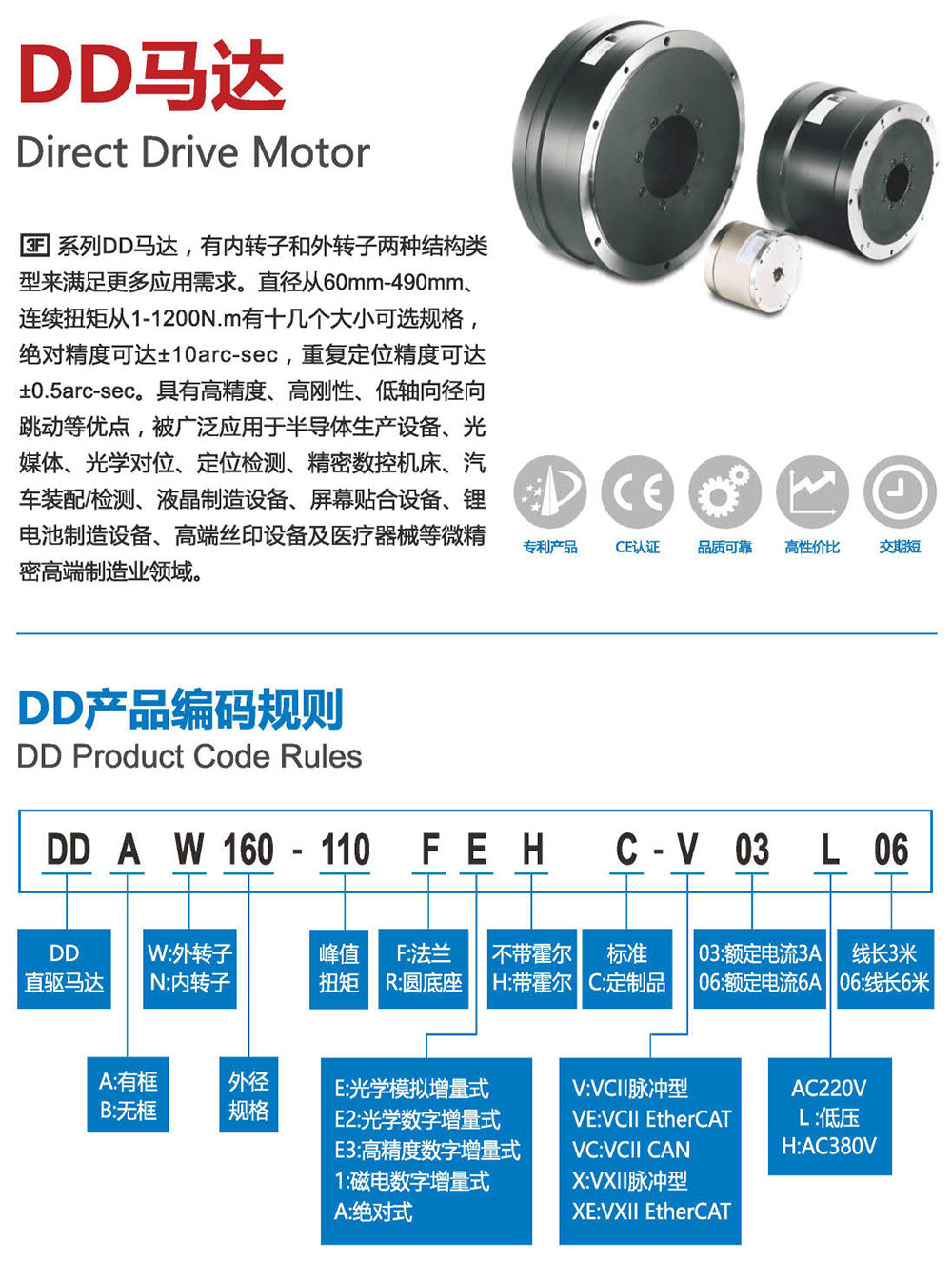 3F系列DD馬達,有內(nèi)轉(zhuǎn)子和外轉(zhuǎn)子兩種結(jié)構類 型來滿足更多應用需求。直徑從60mm- 490mm、 連續(xù)扭矩從1-1200N.m有十幾個大小可選規(guī)格, 精度可達+10arc-sec,重復定位精度可達 +0.5arc-sec。具有高精度、高剛性、低軸向徑向 跳動等優(yōu)點,被廣泛應用于半導體生產(chǎn)設備、光 媒體、光學對位、定位檢測、精密數(shù)控機床、汽 車裝配/檢測、液晶制造設備、屏幕貼合設備、鋰 電池制造設備、高端絲印設備及醫(yī)療器械等微精 密高端制造業(yè)領域。
