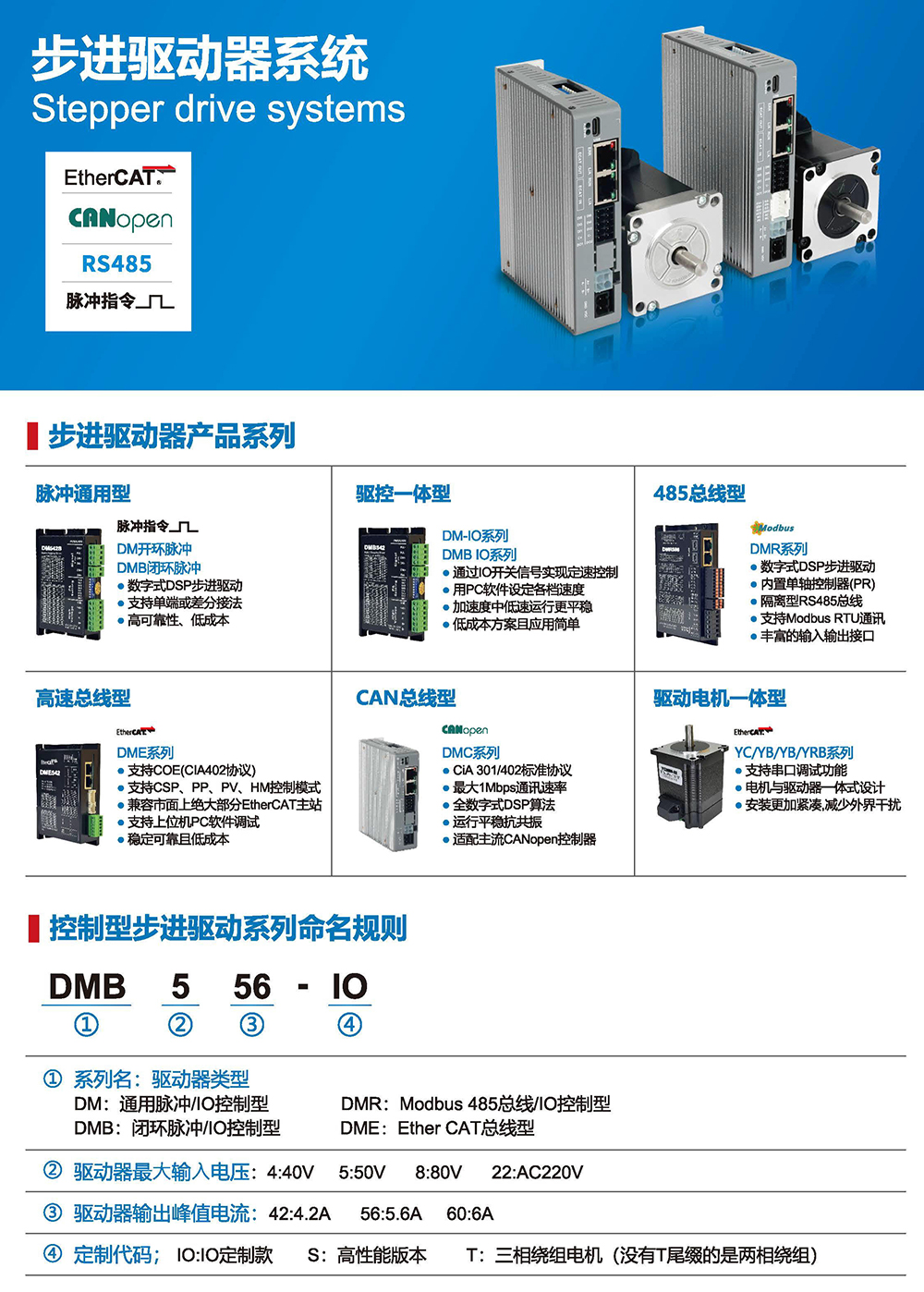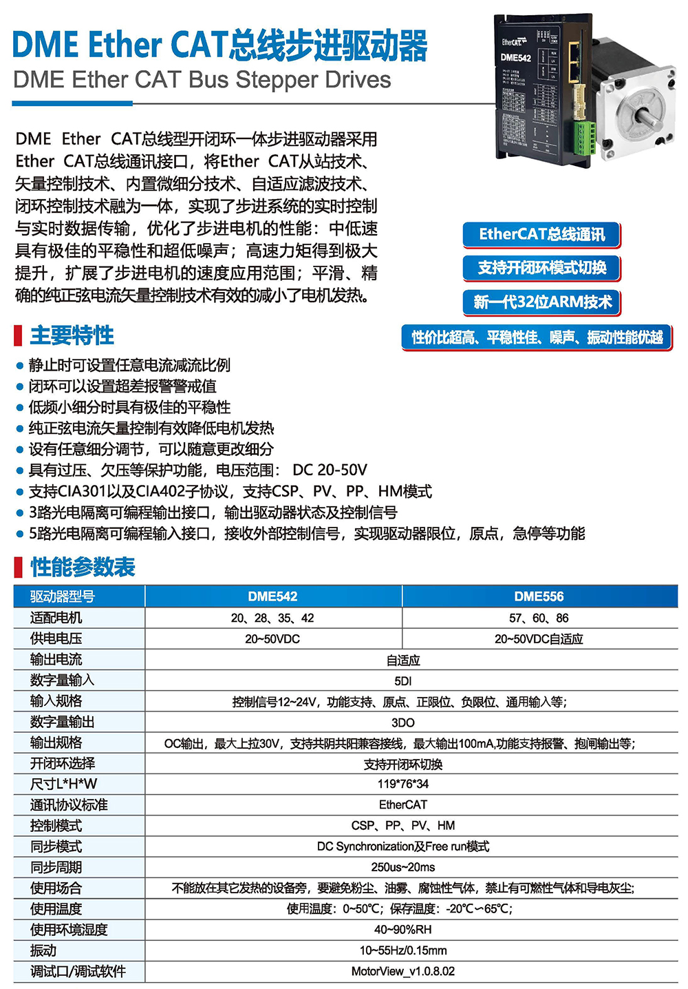 DME Ether CAT總線型開閉環(huán)- -體步進驅動器采用Ether CAT總線通訊接口,將Ether CAT從站技術、矢量控制技術、內置微細分技術、自適應濾波技術、閉環(huán)控制技術融為一-體, 實現(xiàn)了步進系統(tǒng)的實時控制與實時數(shù)據(jù)傳輸,優(yōu)化了步進電機的性能:中低速具有極佳的平穩(wěn)性和超低噪聲;高速力矩得到極大提升,擴展了步進電機的速度應用范圍;平滑、精確的純正弦電流矢量控制技術有效的減小了電機發(fā)熱。