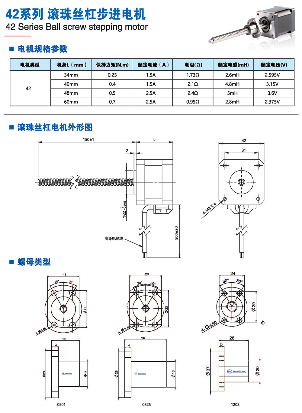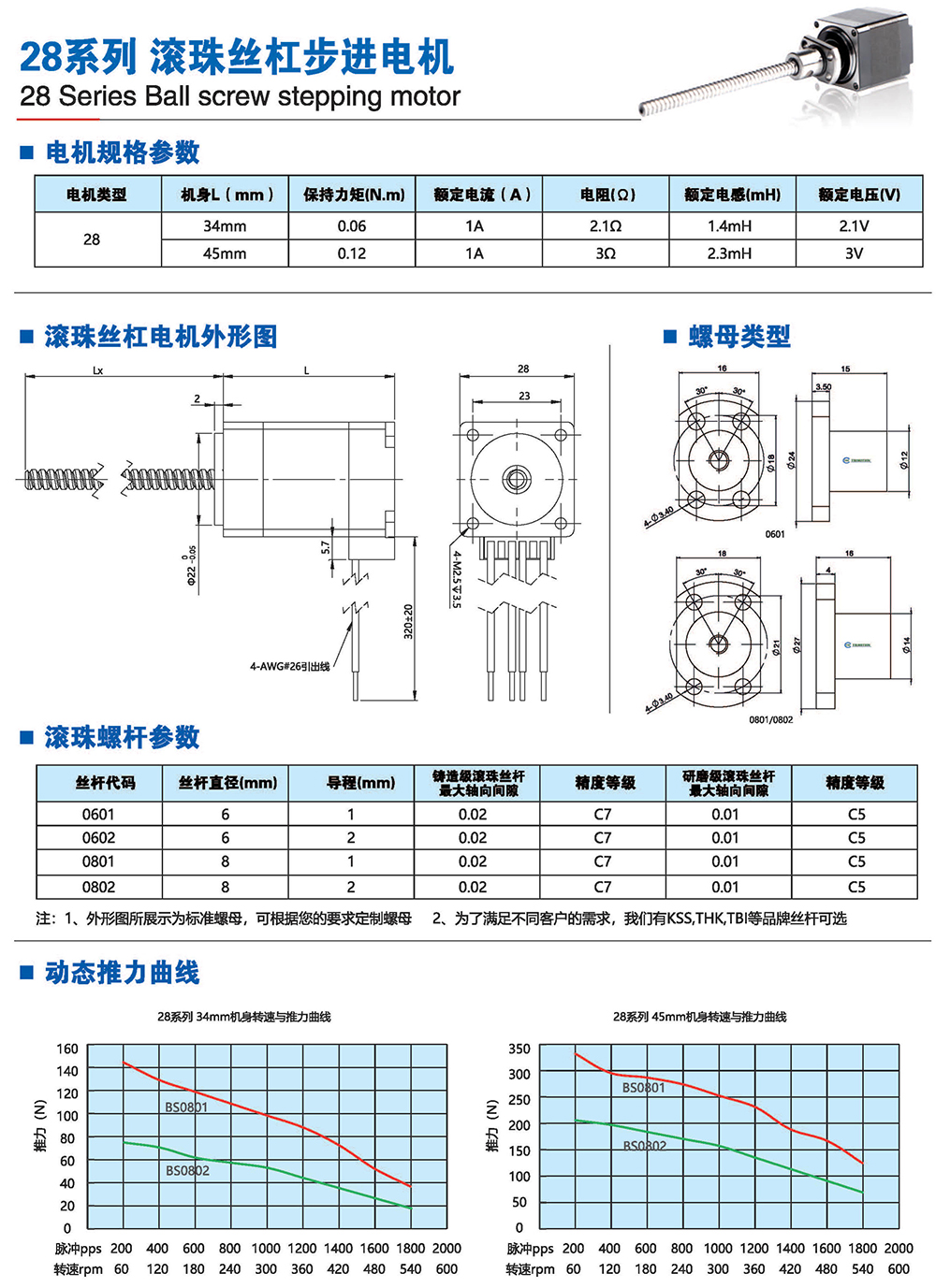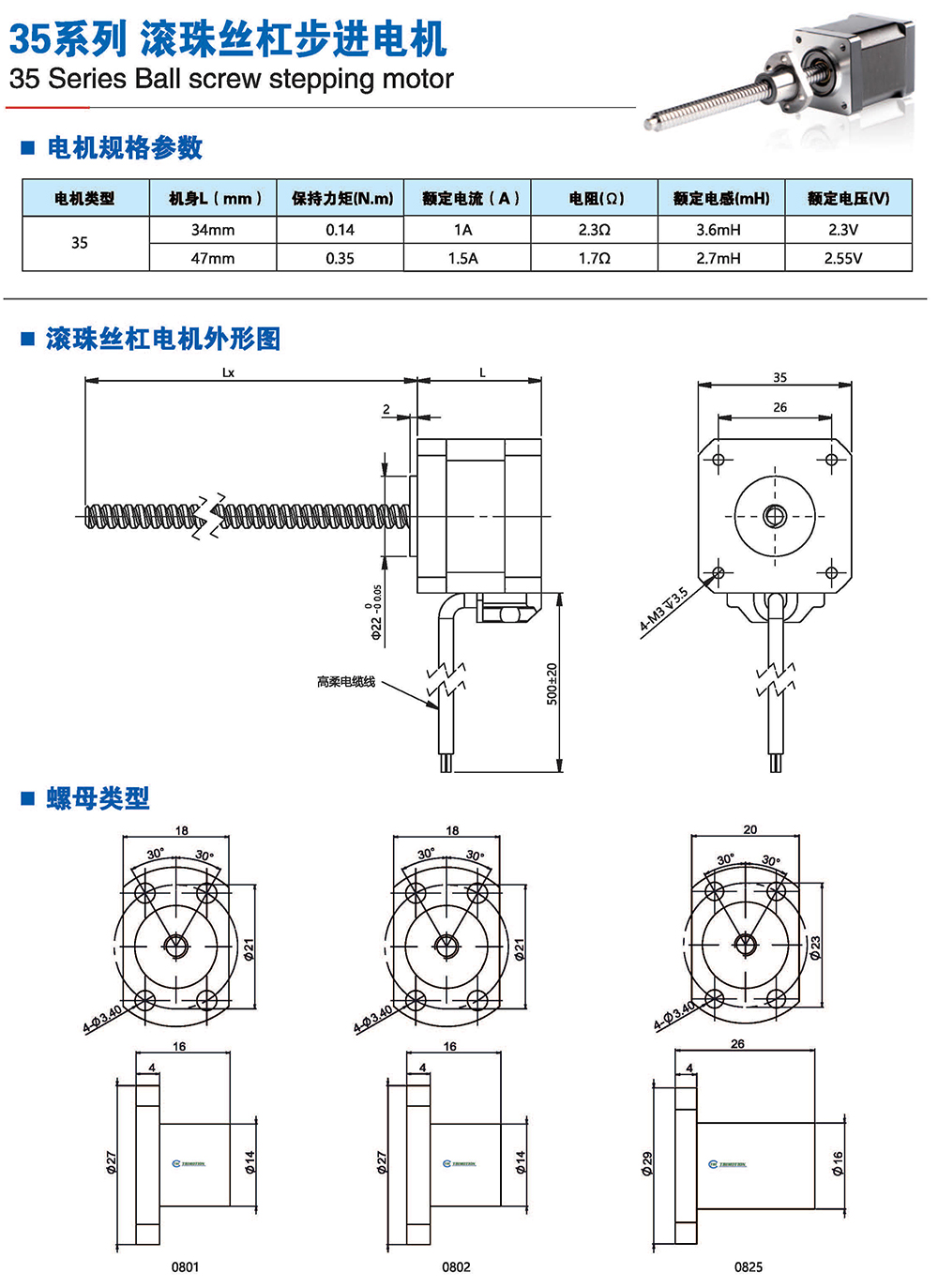 滾珠絲桿步進(jìn)電機(jī)有六種尺寸,外形尺寸從14mm至86mm,滾珠絲桿電機(jī)為外部驅(qū)動式。 從0.005mm/步到0. 1mm/步,有多種步長可選。推力可達(dá)1600N,全系可 選配編碼器。