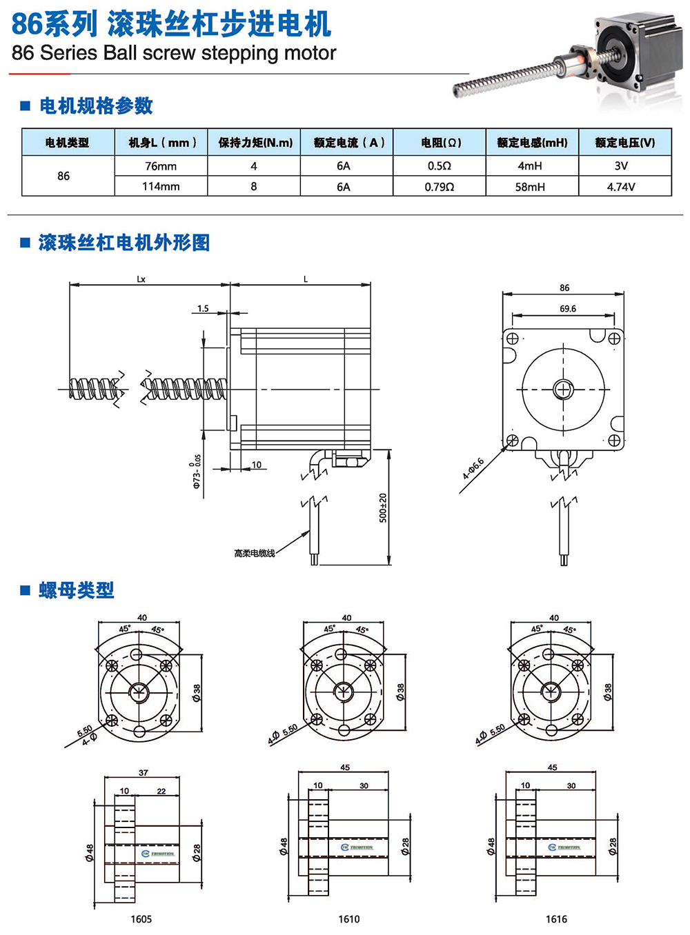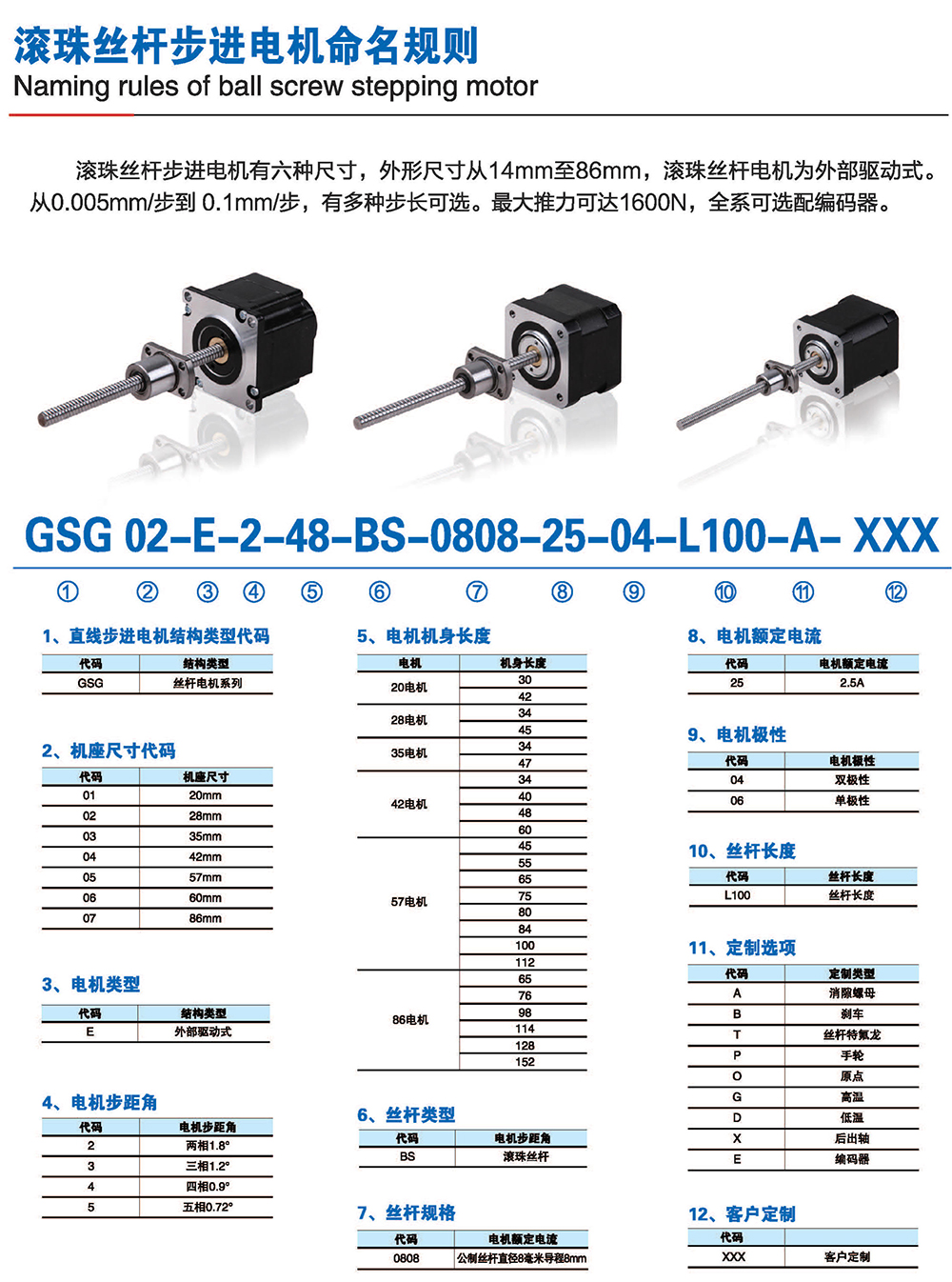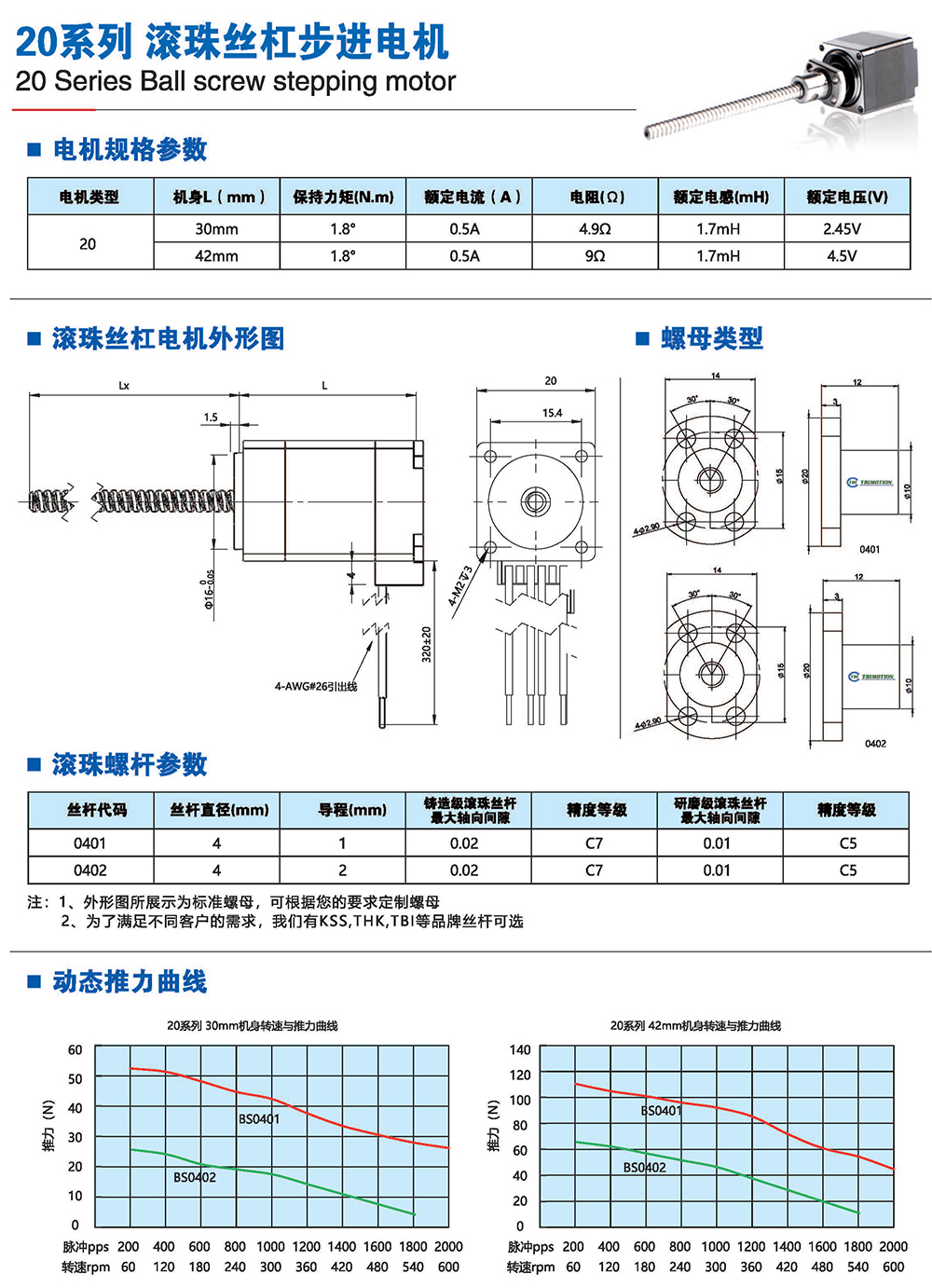滾珠絲桿步進(jìn)電機(jī)有六種尺寸,外形尺寸從14mm至86mm,滾珠絲桿電機(jī)為外部驅(qū)動式。 從0.005mm/步到0. 1mm/步,有多種步長可選。推力可達(dá)1600N,全系可 選配編碼器。