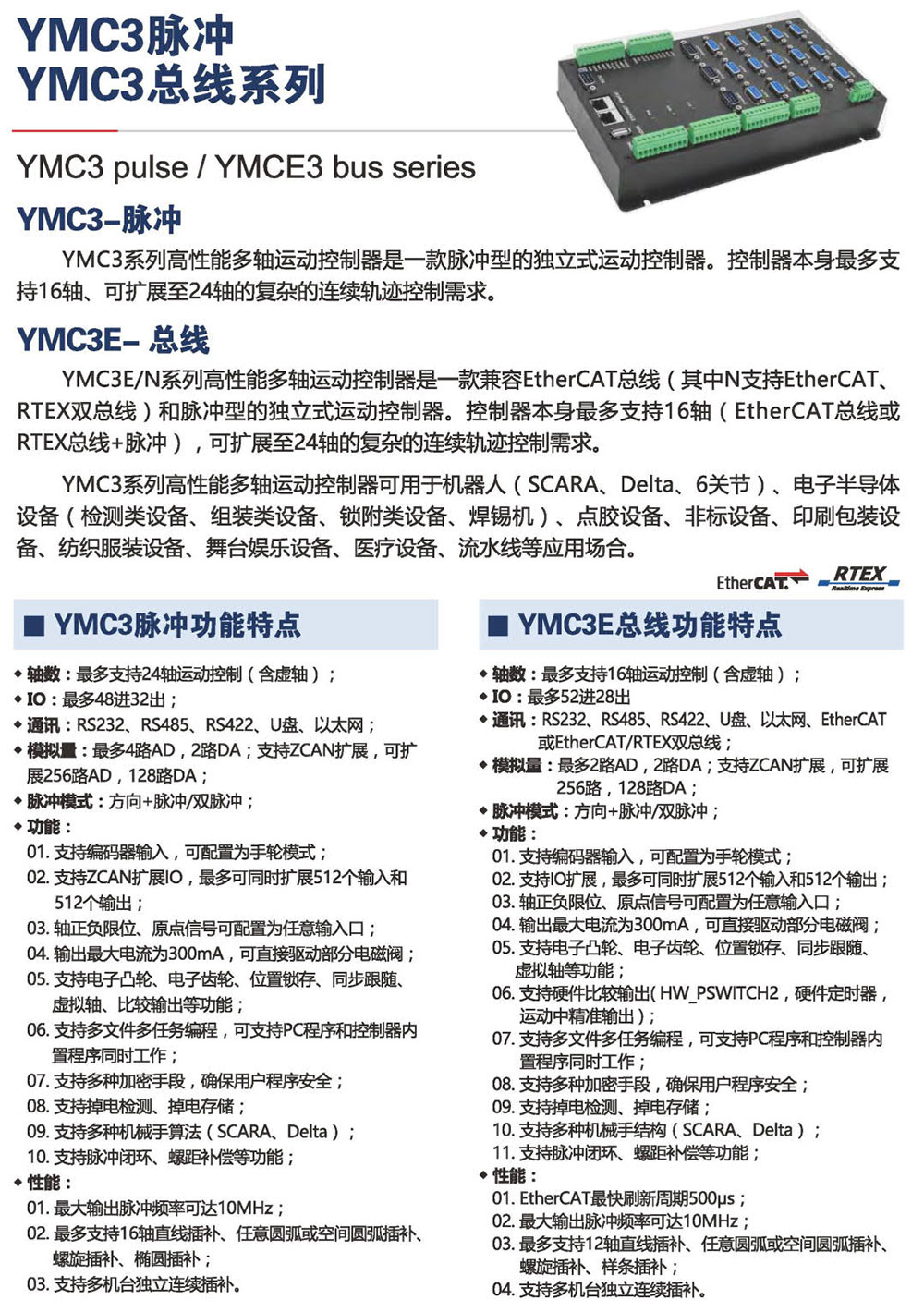 YMC3系列高性能多軸運動控制器是一款脈沖型的獨立式運動控制器。 控制器本身最多支持16軸、可擴展至24軸的復(fù)雜的連續(xù)軌跡控制需求。