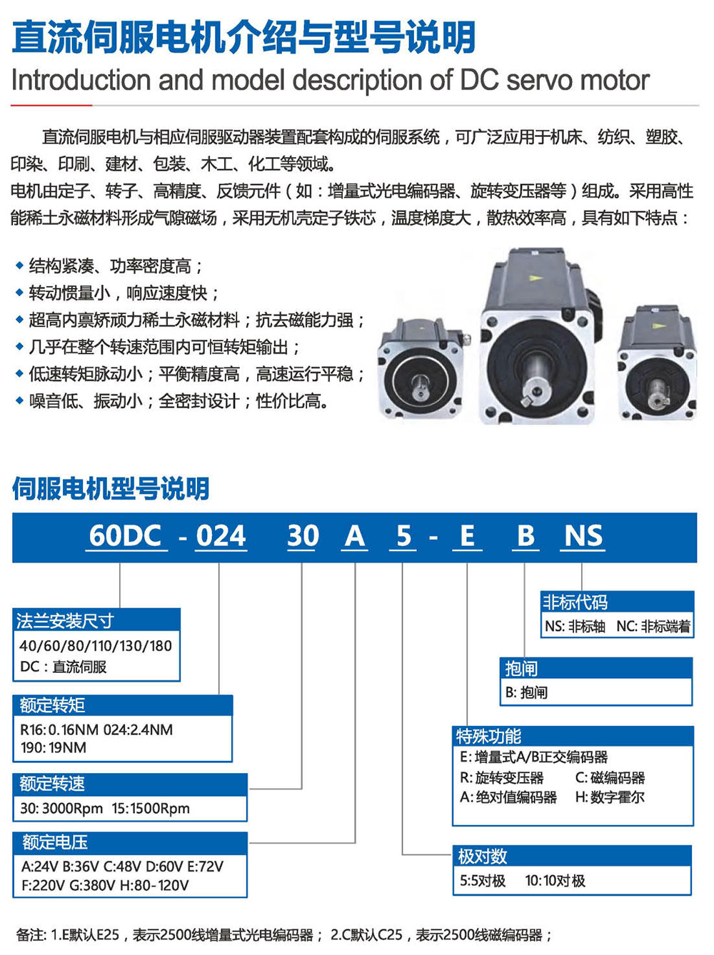 直流伺服電機(jī)與相應(yīng)伺服驅(qū)動器裝置配套構(gòu)成的伺服系統(tǒng),可廣泛應(yīng)用于機(jī)床、紡織、塑膠、印染、印刷、建材、包裝、木工、化工等領(lǐng)域。電機(jī)由定子、轉(zhuǎn)子、高精度、反饋元件(如:增量式光電編碼器、旋轉(zhuǎn)變壓器等)組成。采用高性能稀土永磁材料形成氣隙磁場,采用無機(jī)殼定子鐵芯,溫度梯度大,散熱效率高,具有如下特點(diǎn):