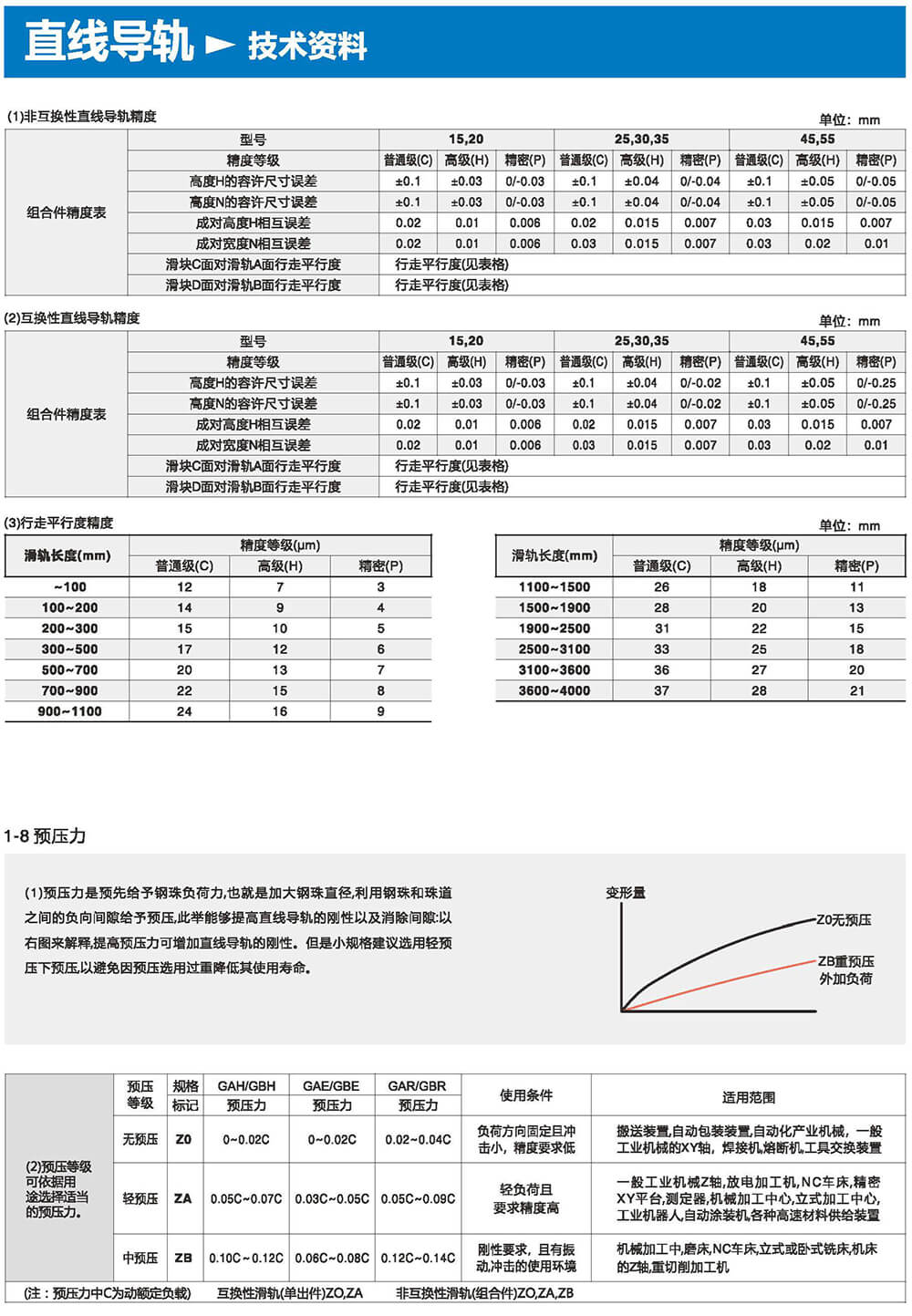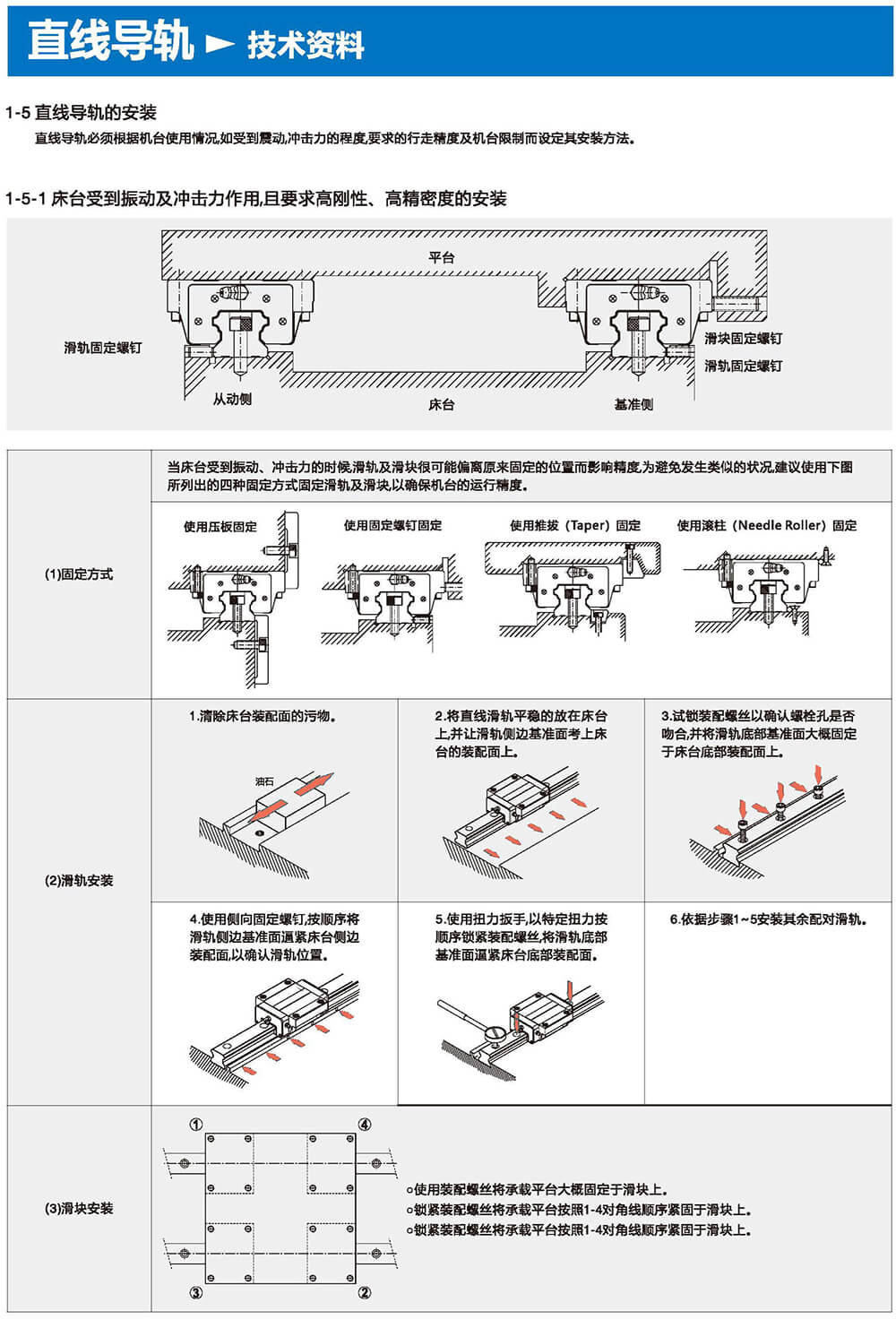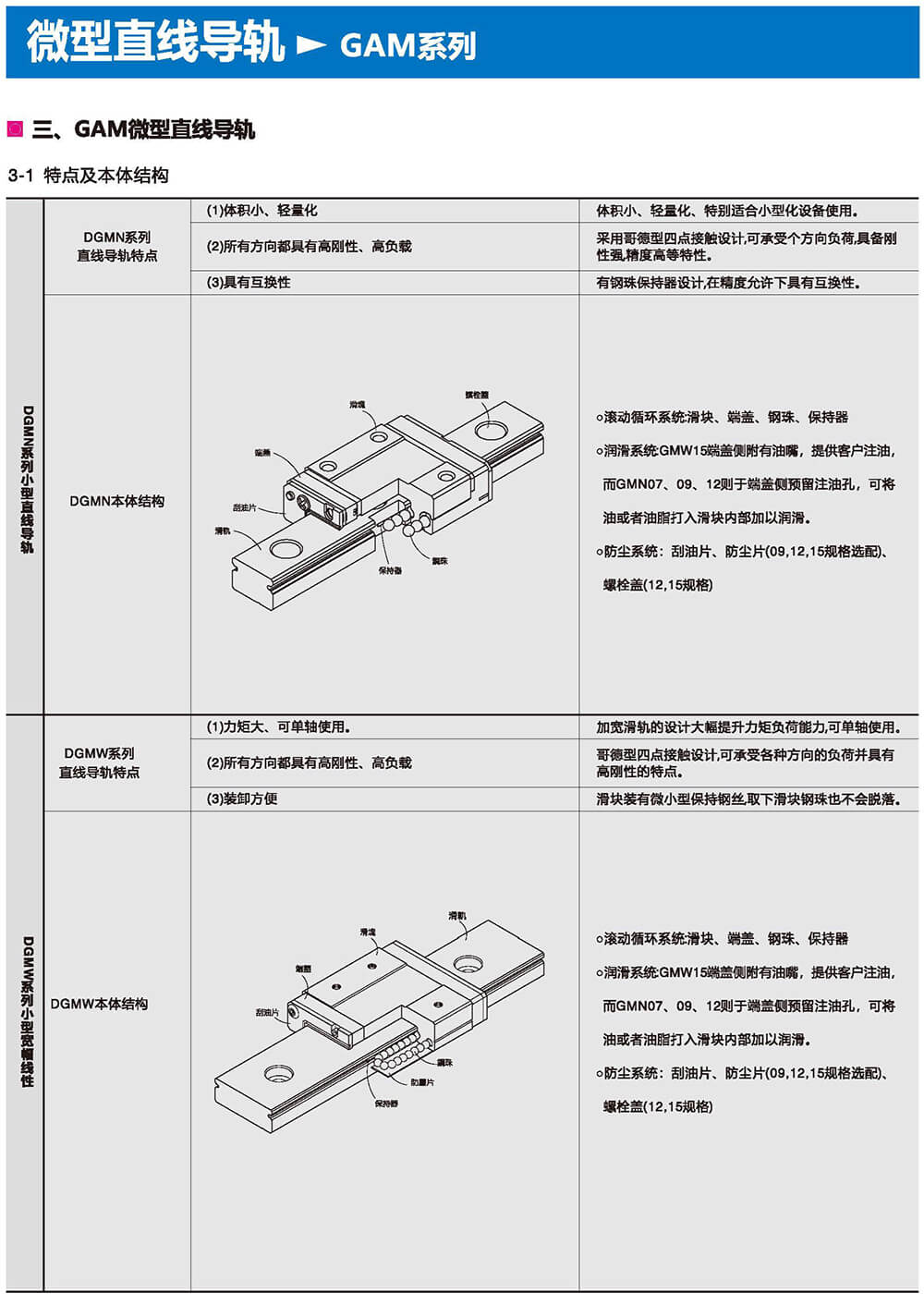 直線導(dǎo)軌由鋼珠在滑塊與滑軌之間作無限滾動循環(huán)負(fù)載平臺能沿著滑軌輕易地以高精度做線性運動。與傳統(tǒng)的滑動導(dǎo)引相比較滾動引導(dǎo)的摩擦系數(shù)可降低至1/50,由于啟動的摩擦力大大減少,相對的較少無效運動發(fā)生故而能輕易達(dá)到μum級進給及定位。在加上滑塊與滑軌的束制單元設(shè)計,使得線性導(dǎo)軌可同時承受上下左右等各個方向的負(fù)荷上述陳列特點并非傳統(tǒng)滑動導(dǎo)引所能比擬因此機臺若能配合滾珠螺桿,使用線性導(dǎo)軌作導(dǎo)引必能大幅提高設(shè)備精度與機械效能。